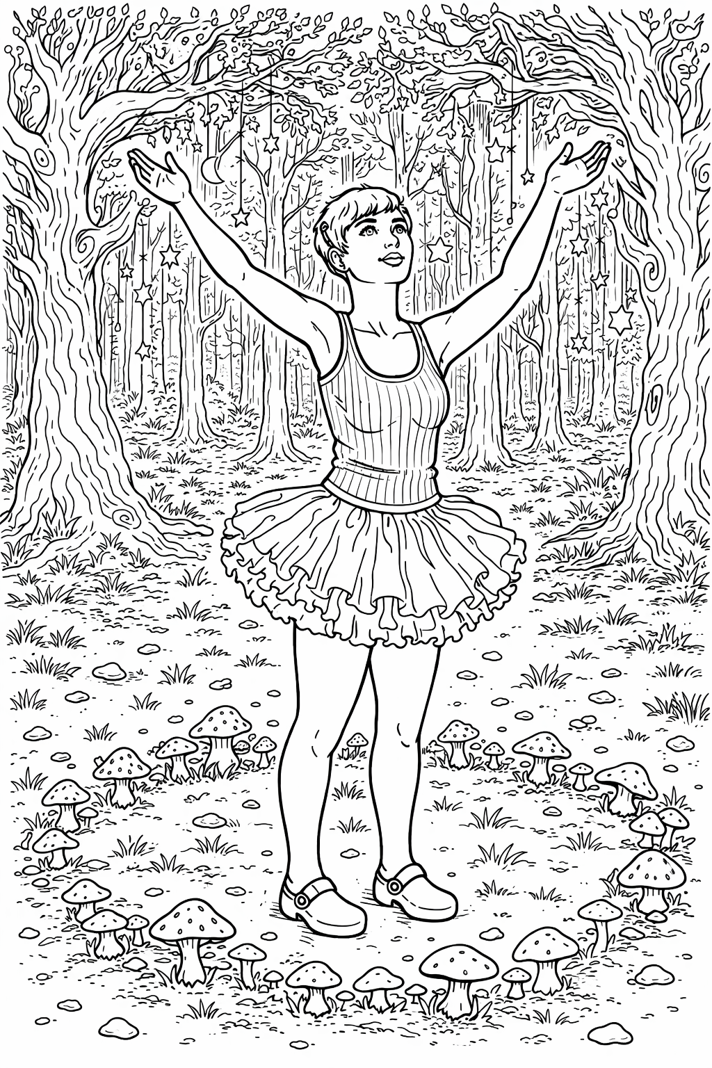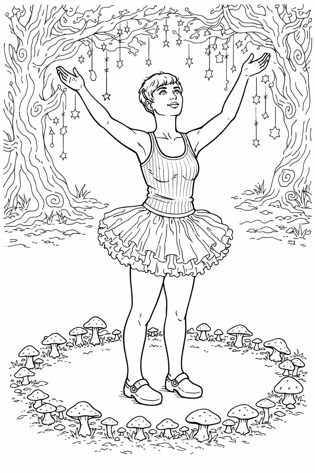 I just started using ChatGPT image generation. One of my prompts was "A woman with a pixie hair cut is standing in the middle of a fairy ring. She’s wearing a tutu, a ribbed tank top, and clogs. She is holding her arms in the air as if she’s waiting for something. In the background is magical looking trees. The style of the image should be black line art on a white back ground with no grays or shadows." It produced this: